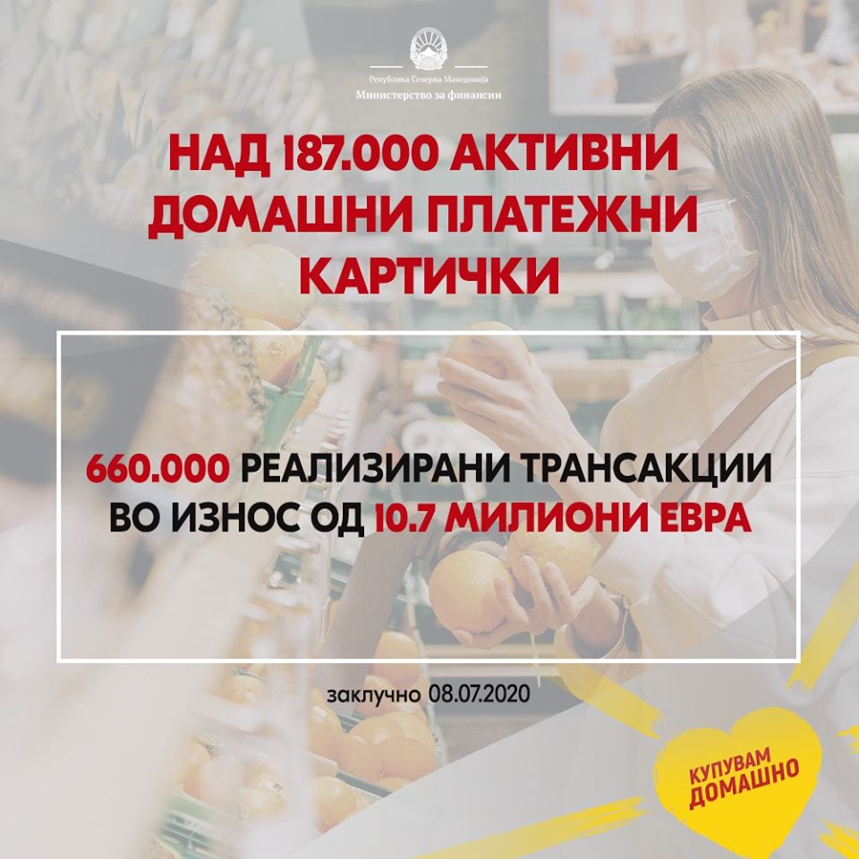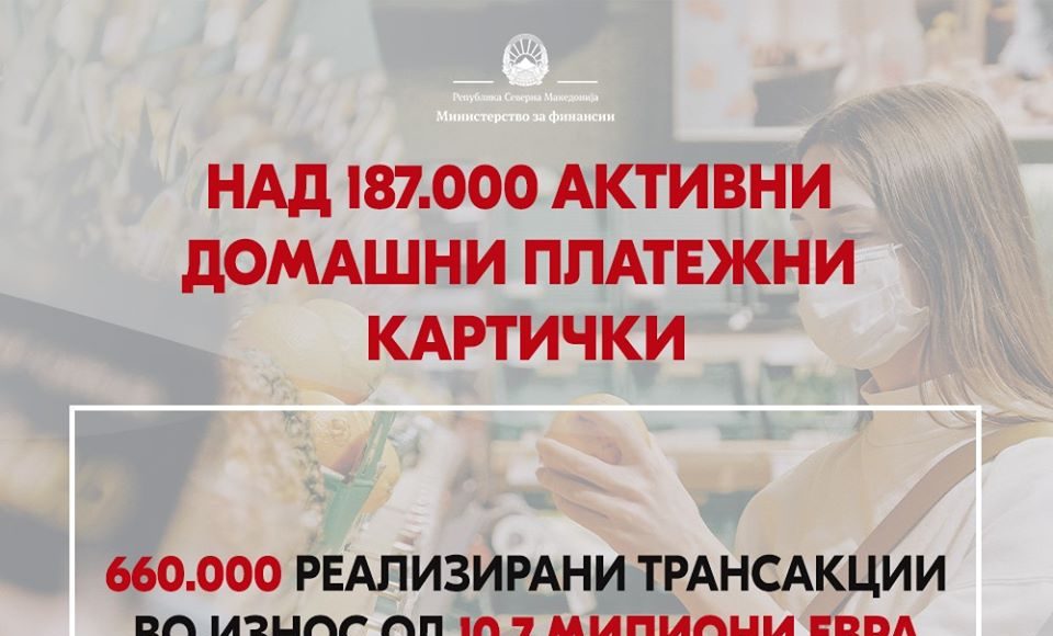 Министерката за финансии Нина Ангеловска информираше дека преку 187.000 домашни платежни картички се веќе активни и граѓаните со нив направиле над 660.000 трансакции.