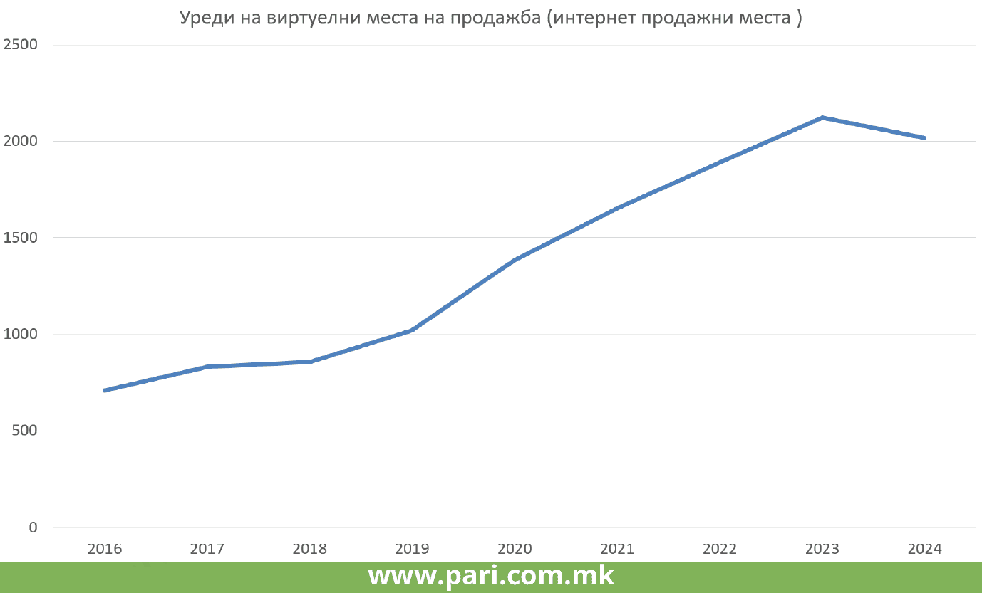 Тоа се гледа од повеќе параметри, според кои порталот Пари направи анализа. Во јануари 2016 година, во земјава имало 585 уреди за плаќање на виртуелни места на продажба, односно на продажни места на интернет. До 2020 година нивниот број се зголемил двојно, а до крајот на 2023 година се зголемил скоро 4 пати. Но, во 2024 година настанува стагнација, која на крај резултира и со помал број уреди на места за е-трговија. На почетокот од годината имало 2.076 места, а на крајот 2.016.