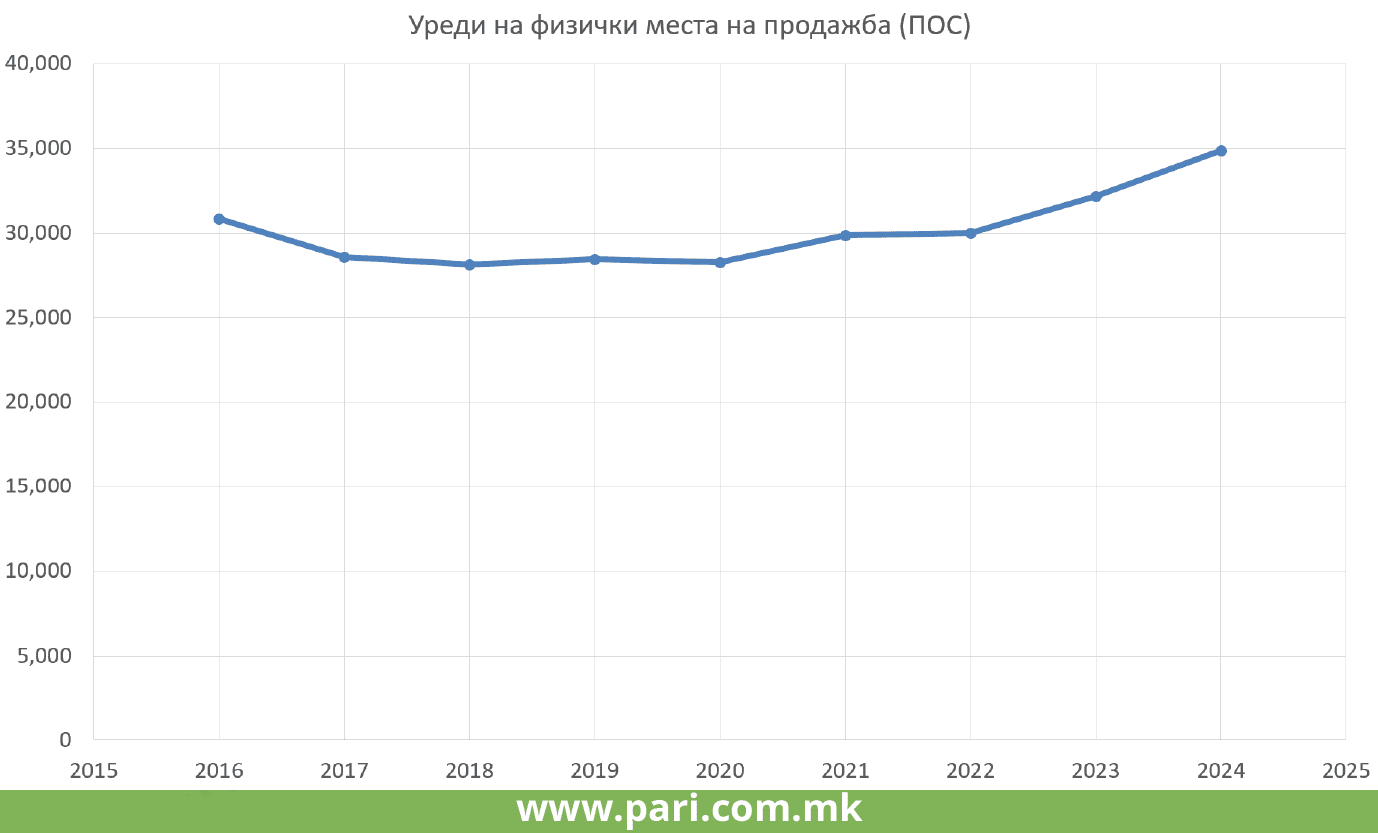 Во трговијата со физички места на продажба расте бројот на ПОС терминалски уреди и тоа со побрзо темпо од претходно. На крајот од 2024 година се регистрирани 34.864 ПОС терминали, што е раст од 2.000 за една година. Во 2023 година, исто така, бројот на ПОС терминали е зголемен за околу 2.000, додека во претходната година растот бил поумерен. Интересно е дека во 2016 и во 2017 година имало поголем број ПОС терминали, но во 2018 година нивниот број се намалува за околу 3.000.