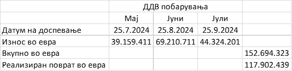 Податоците покажуваат дека во овој период фирмите доставиле барања за поврат во висина од над 152 милиони евра, а исплатени се 118 милиони евра.