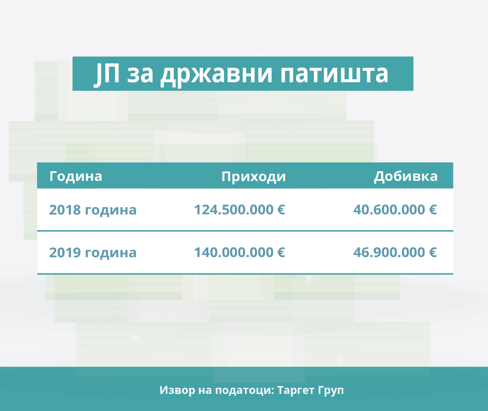 Минатата година била финансиски подобра од 2018 година. ЈП за државни патишта во 2018 година имало добивка 40,6 милиони евра, додека приходите биле 124,5 милиони евра.