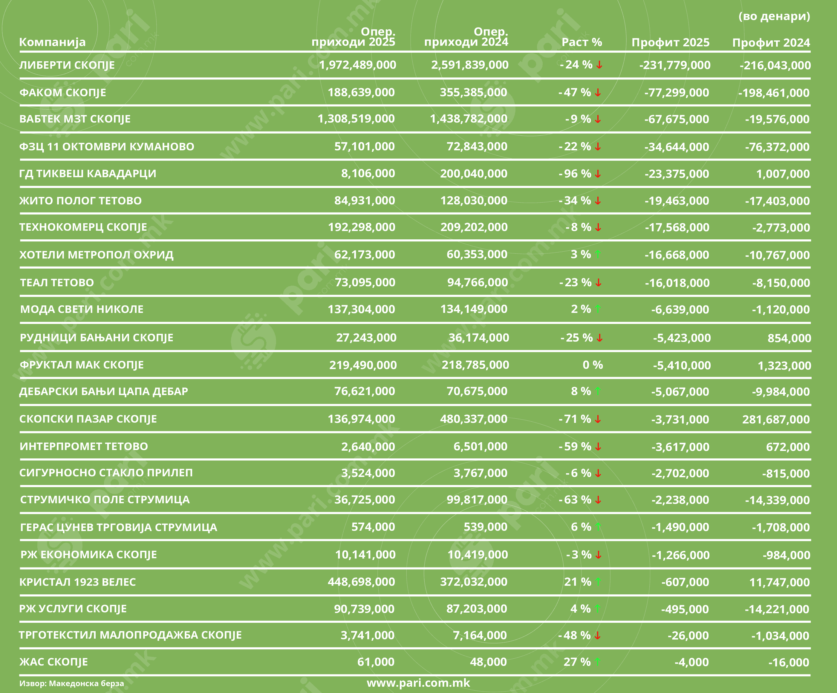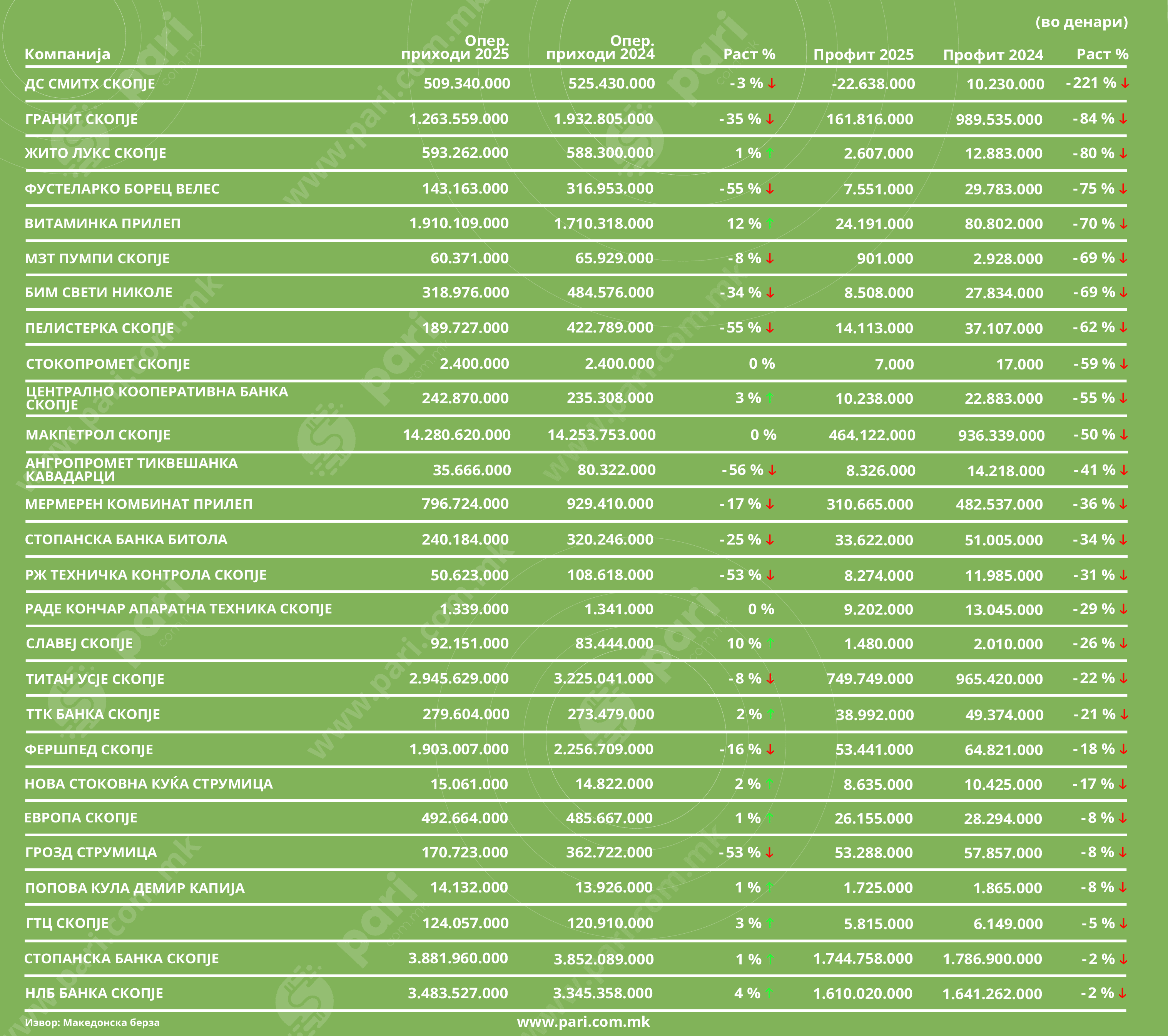 Како изгледа сликата на македонскиот бизнис во 2025 година? Анализиравме финансиски извештаи на котирани компании според остварените приходи и профити, односно загуби. На многу позиции свети црвено. Во убедливо најлоша позиција е компанијата ДС Смитс, со годишен пад на профитот од дури – 221 %. Не само што го нема минатогодишниот профит од 10,2 милиони денари, туку оваа компанија бележи и загуба од 22,6 милиони денари во првата половина од годинава. Намалени се и приходите на компанијата, но само за незначителни 3 %.