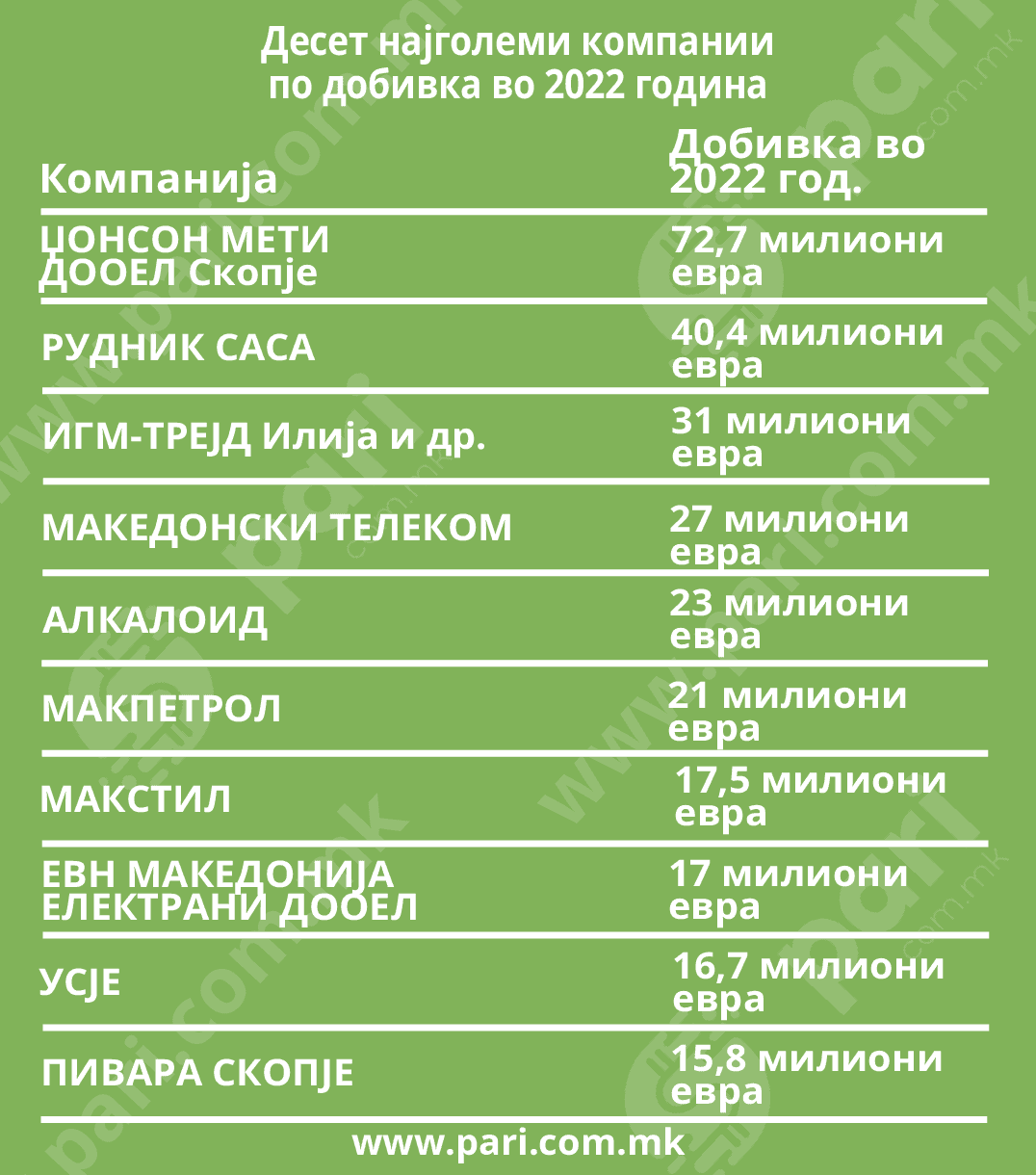 Овие десет најпрофитни компании направиле 282 милиони евра профит, а профитите се движеле од 15,8 милиони евра на десетто пласираната Пивара, па сѐ до 72,7 милиони евра на првопласираната Џонсон мети.