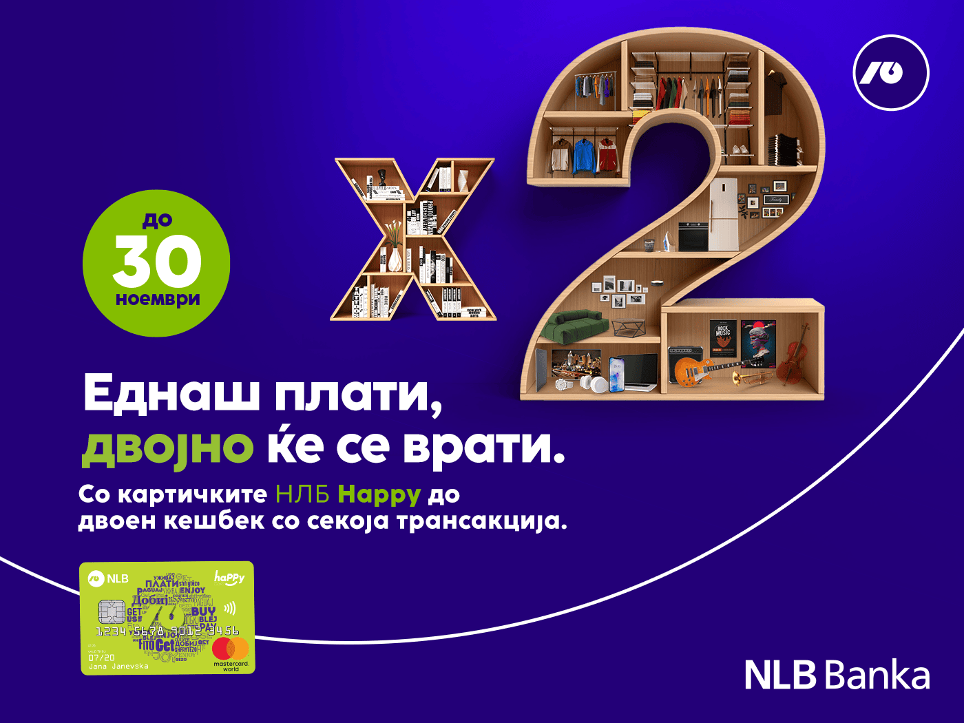 Да се поседува НЛБ haPPy картичка овој месец е вистинска привилегија. Сите нови и постоечки корисници на НЛБ haPPy картичките во промотивниот период до крајот на ноември, ќе имаат можност за секоја направена трансакција, да добијат двојно поголем поврат на средства – од 1,2% од вредноста на трансакцијата, па сè до максимални 24%, во зависност од продажното место.