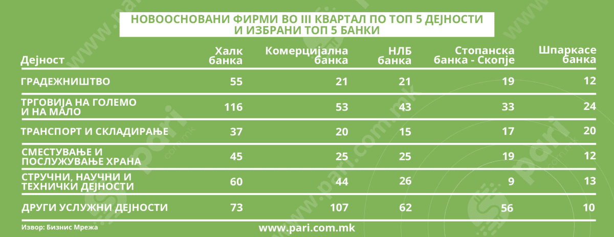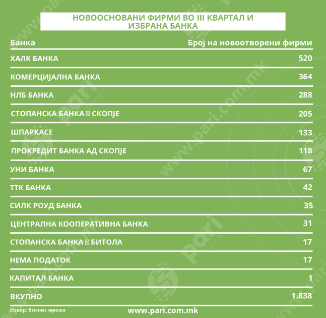 Како и во претходните неколку години, и во ова тримесечје првиот избор на основачите на нови бизниси е Халк банка, со отворени 520 сметки од новоформираните фирми, што претставува речиси една третина (28,29 %). Следуваат Комерцијална банка со 364 и НЛБ банка со 288 нови фирми. Во првата петорка се и Стопанска банка ‒ Скопје (205) и Шпаркасе банка (133). Останатите банки имаат помало учество.