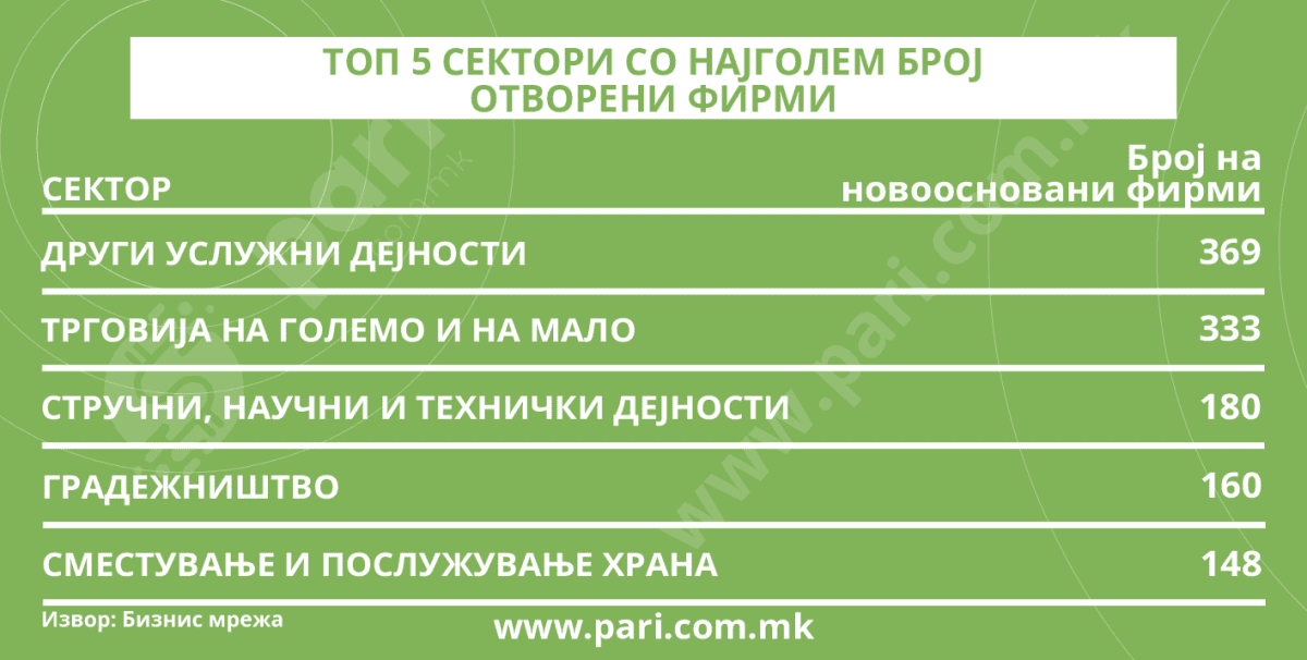Што се однесува до видот на отпочнатите бизниси, најголем дел од иницијаторите – 369, се одлучиле за други услужни дејности. Тука спаѓаат фризерски и козметички салони, перење и хемиско чистење, поправки на компјутери и апарати за домаќинство, како и низа други индивидуални услуги. Голем е и интересот за трговијата на големо и на мало. Отворени се 333 нови фирми.