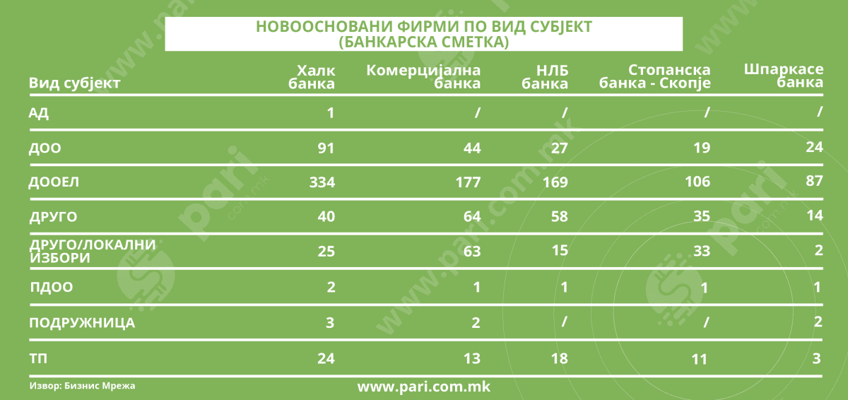 Вообичаено, според вид субјект, апсолутна е доминацијата на формата ДООЕЛ. Само во кварталната евиденција на Халк банка се заведени 334 нови фирми од овој тип. Потоа, во Комерцијална банка биле отворени 177, а во НЛБ банка 169 сметки. Сѐ на сѐ, и натаму најпопуларни се микробизнисите, најчесто основани од еден сопственик, со ограничен почетен капитал и со фокус на локалниот пазар.