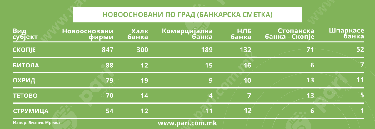 На територијата на државата, по Скопје, најголемата активност во формирањето бизниси е лоцирана во Битола (88), каде што меѓу банките фаворит е НЛБ банка (16). На листата ТОП 5 градови со најмногу нови фирми се и Охрид (79), Тетово (70) и Струмица (54). Од аспект на овие бројки, тоа се регионалните деловни јадра, особено за трговија, услуги и туризам. Уште е забележливо дека во Струмица ориентацијата е кон Халк банка и НЛБ банка, со отворени сметки од по 12 фирми. Зад нив е Комерцијална банка (11).