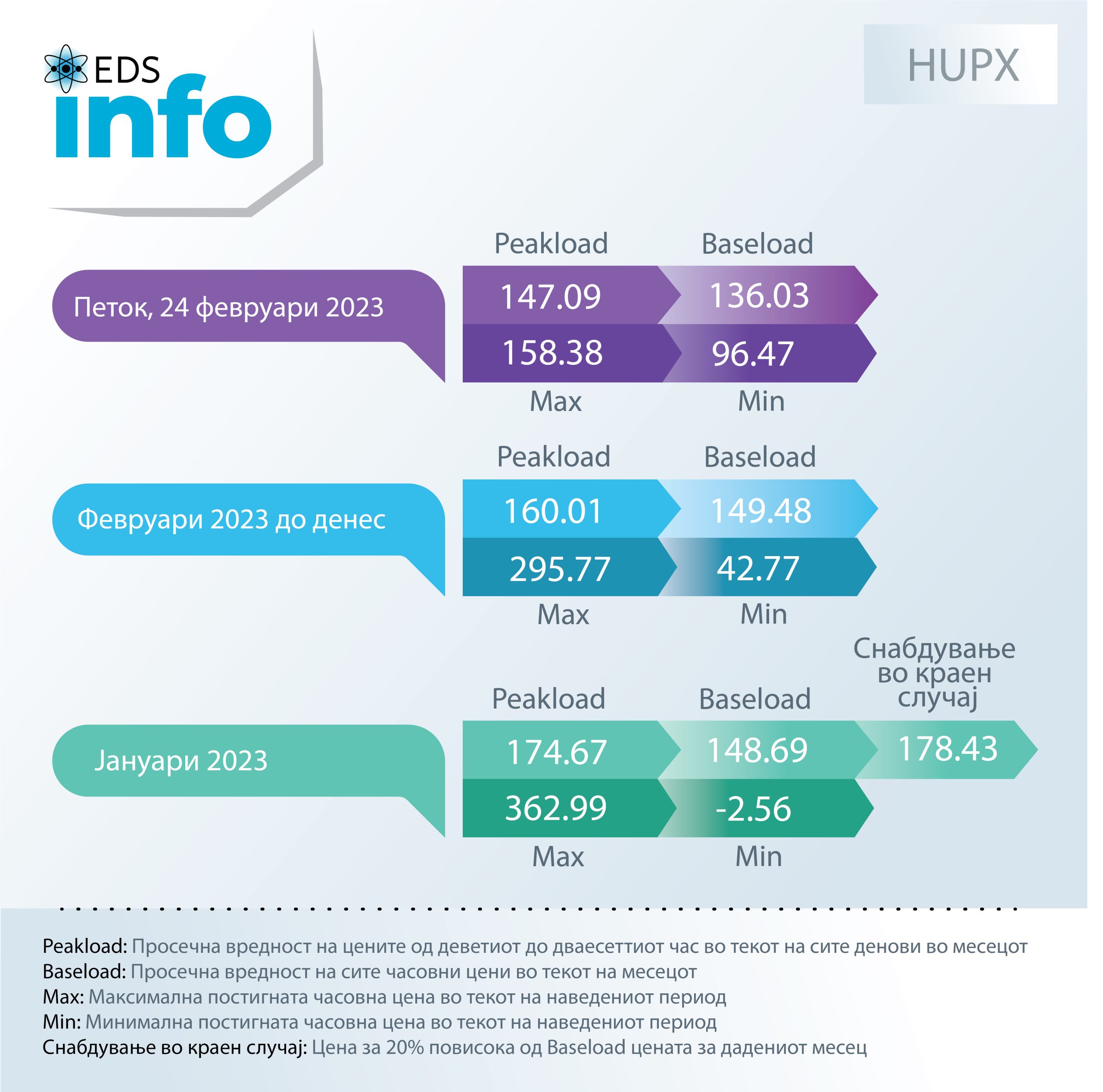 Согласно податоците за движењето на цените на берзата HUPX во Унгарија за 24 февруари просечната часовна цена на еден мегават час електрична енергија (baseload) изнесува 136,03 евра/mwh.
