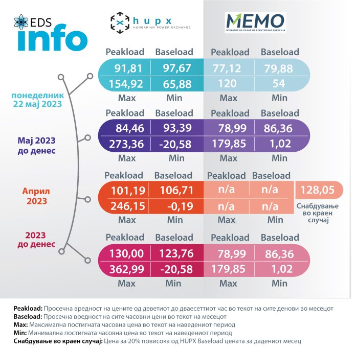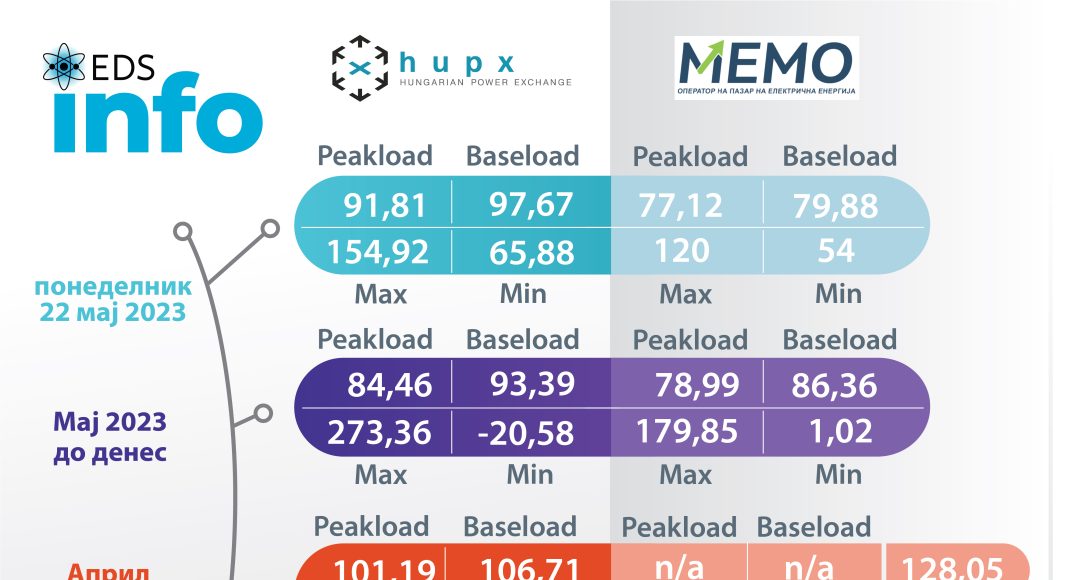 Согласно податоците за движењето на цените на берзата HUPX во Унгарија за 22 мај просечната часовна цена на еден мегават час електрична енергија (baseload) изнесува  97,67  евра/mwh, додека на Македонската берза за електрична енергија цената е 79,88 евра/mwh
