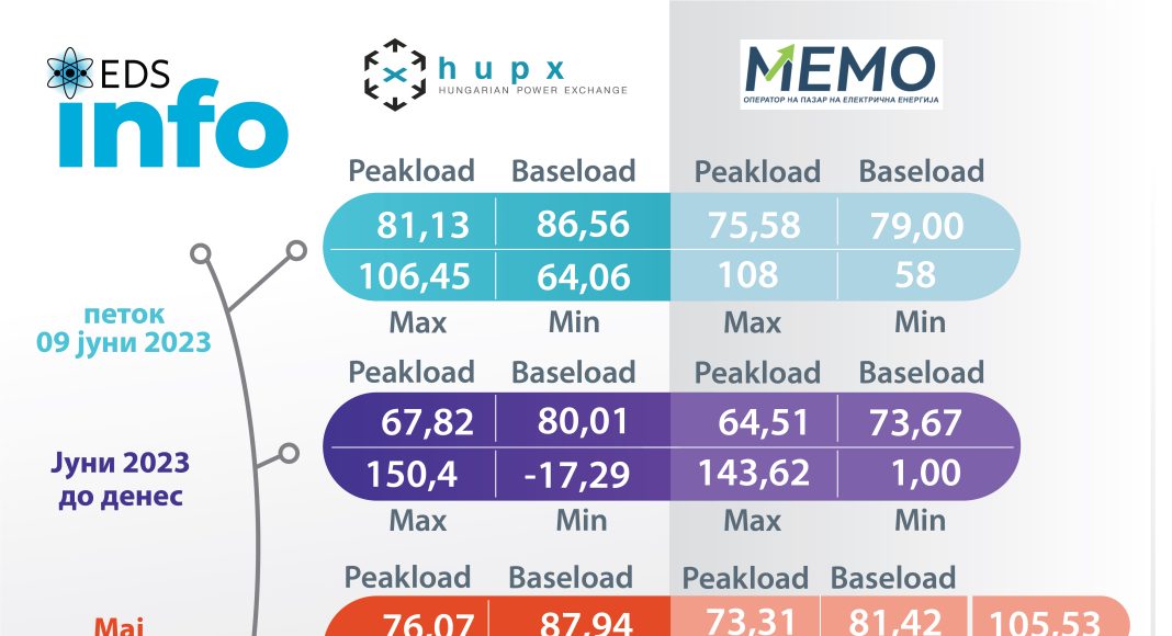 Цената на електричната енергија во текот на дневните часови (9:00 – 20:00) (peakload) на HUPX постигна ниво 81,13 евра за мегават час, а на MEMO 75,58 евра.