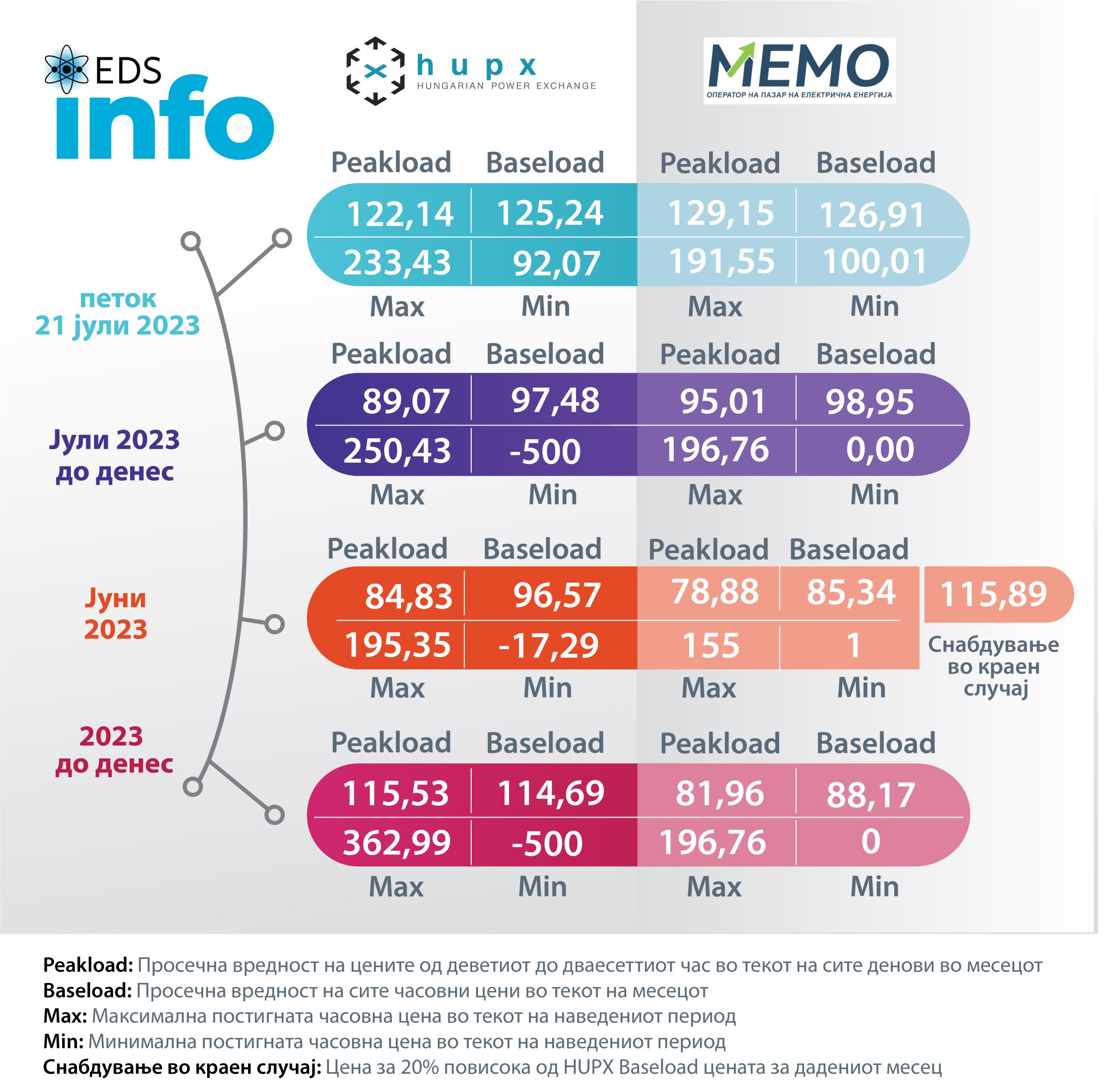 Согласно податоците за движењето на цените на берзата HUPX во Унгарија за 21 јули просечната часовна цена на еден мегават час електрична енергија (baseload) изнесува 125,24 евра/mwh, додека на Македонската берза за електрична енергија цената е 126,91 евра/mwh