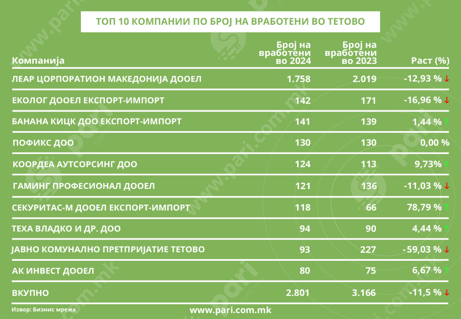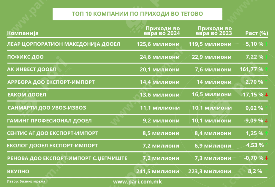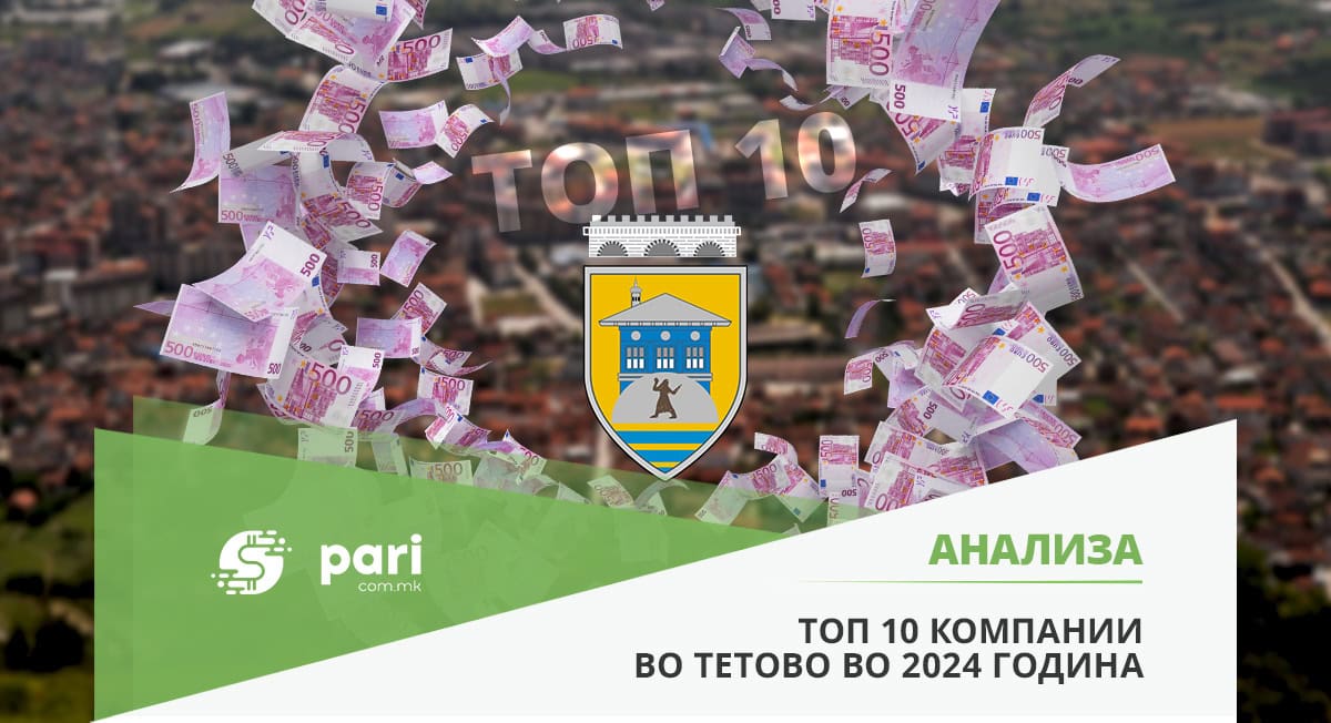 Анализата на порталот Пари во соработка со Бизнис мрежа ги разгледува десетте најголеми компании во Тетово. Во 2024 година, водечките компании оствариле вкупен приход од 241,5 милиони евра, што е раст од 8,2 насто во однос на 2023 година. Вкупната добивка се искачила на 15,9 милиони евра, што претставува раст од 7,4 насто, додека бројот на вработени паднал на 2.801 лице, односно 11,5 насто помалку од претходната година.