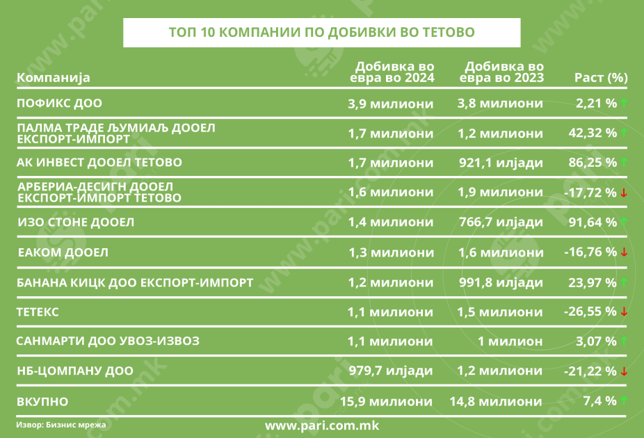 Десетте најпрофитабилни компании во Тетово имаат заедничко остварување од 15,9 милиони евра. Финансиската слика е подобра за 7,4 насто. Треба да се напомене дека осум од најпрофитните не се и во друштвото на најприходните. Се повторуваат ПОФИКС, кој е лидер од табелата со профит од 3,9 милиони евра, и АК ИНВЕСТ со 1,7 милиони евра е на третото место по добивка, исто како и по приход.