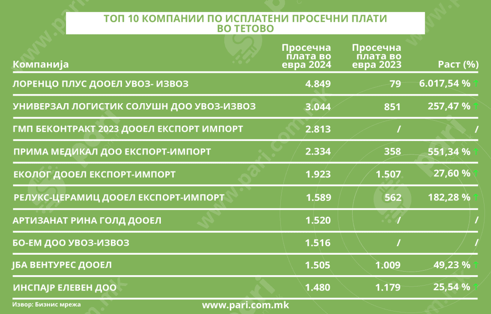 Вкупната сума на прикажаните просечни плати кај овие десет компании во 2024 година изнесува 22.573 евра, наспроти само 5.545 евра во 2023 година, што скок од дури 307 насто. На врвот е ЛОРЕНЦО ПЛУС, со просечна плата од 4.849 евра, што претставува екстремен раст во однос на ланските 79 евра, а имал по 10 вработени и во 2023 и во 2024 година. Веднаш зад неа е УНИВЕРЗАЛ ЛОГИСТИК СОЛУШН со 3.044 евра и раст од 257 насто. Оваа фирма имала само еден вработен во 2024 година, а преклани броела 3 лица.