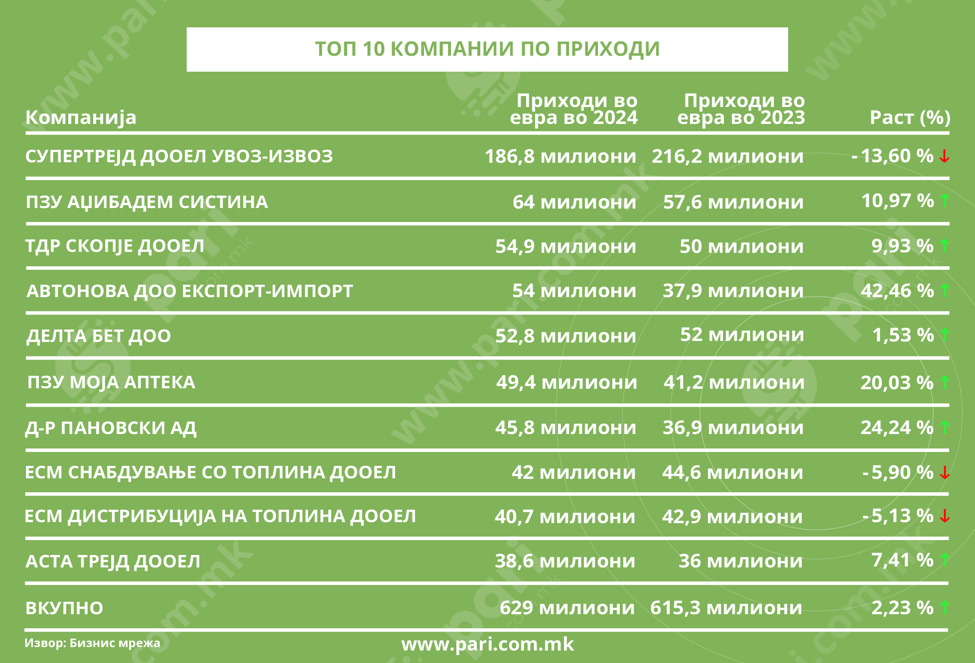 Вкупниот приход на ударната карпошова десетка минатата година изнесувал 629 милиони евра, проследен со зголемување од 2,23 насто. Тоа, пак, произлегува од растот регистриран кај седум од нив.