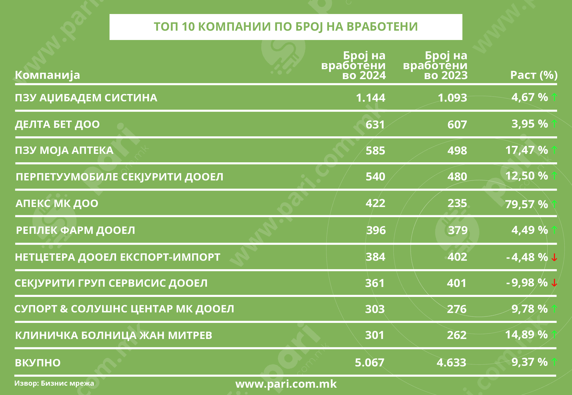 На оваа листа има и други компании од фармацијата и здравството: на трето место, со 585 вработени, е Моја аптека, сегмент од компанијата Зегин; на шесто место е Реплек фарм (396) и на десетто место е Клиничката болница Жан Митрев (301).