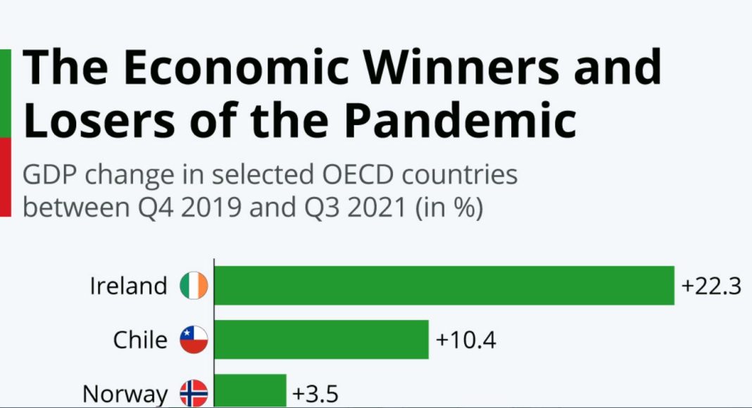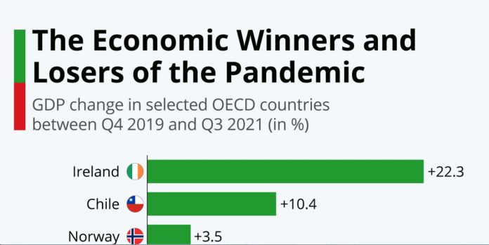 Додека пандемијата на коронавирус сè уште трае, економиите на повеќето земји на ОЕЦД почнаа да се опоравуваат од ефектите од 2020 година. Според податоците акумулирани од The ​​Economist, Ирска е нацијата со највисок пораст на бруто домашниот производ БДП помеѓу четвртиот квартал на 2019 и третиот квартал на 2021, зголемувајќи се својот домашен производ за 22,3 отсто. Иако е импресивен, овој резултат е исклучок наместо норма како што покажува табелата, која ја изготви германскиот сајт Статиста.
