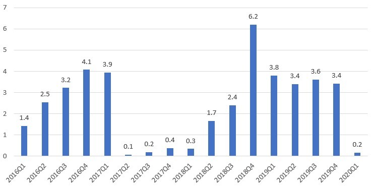 Ниските перформанси во првиот квартал од 2020 делумно се поради повисокиот пораст остварен во првиот квартал од минатата година (Слика 1). За споредба, податоците на Евростат за 27-те земји членки на ЕУ укажуваат на просечен пад на БДП од -2,5% за земјите-членки на ЕУ за првиот квартал на 2020 година. За земјите од регионот, податоците се достапни само за Србија, каде растот на БДП во првиот квартал од 2020 година достигна 5%.