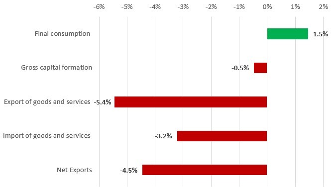Слика 2 ги прикажува стапките на раст на расходните компоненти на БДП. Само крајната потрошувачка забележа позитивна стапка на раст од 1,5%, главно како резултат на зголемување на јавната потрошувачка од 2,4%, иако приватната потрошувачка исто така се зголеми за 1,2%. Оттука, крајната потрошувачка е единствениот позитивен двигател на растот, придонесувајќи 1,3 процентни поени на вкупната стапка на раст. Од друга страна, нето-извозот и бруто инвестициите негативно се одразија на економскиот раст за – 0,9 и – 0,2 процентн, респективно. Ова главно се должи на застојот во меѓународната трговија како резултат на намалената понуда и побарувачка за производи и услуги, како во Македонија, така и во сите други земји (и нашите најголеми трговски партнери).