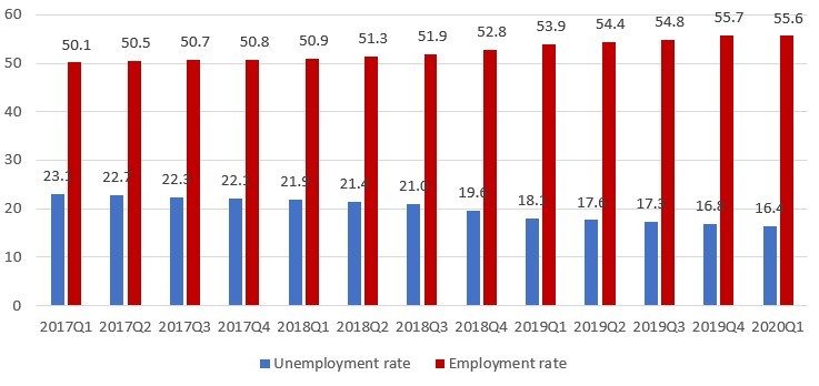 И покрај неповолните движења на производството во првиот квартал од 2020, пазарот на трудот го продолжи позитивниот тренд. Според теоријата и практиката, развојот на БДП (производна страна) влијае на вработувањето и пазарот на трудот со одредено временско заостанување. Како што покажува слика 4, стапката на невработеност падна на 16,4% во К-1, од 18,1% пред една година. Во исто време, стапката на вработеност се зголеми за 1,7 процентни поени на 55,6%, во однос на истиот квартал лани.