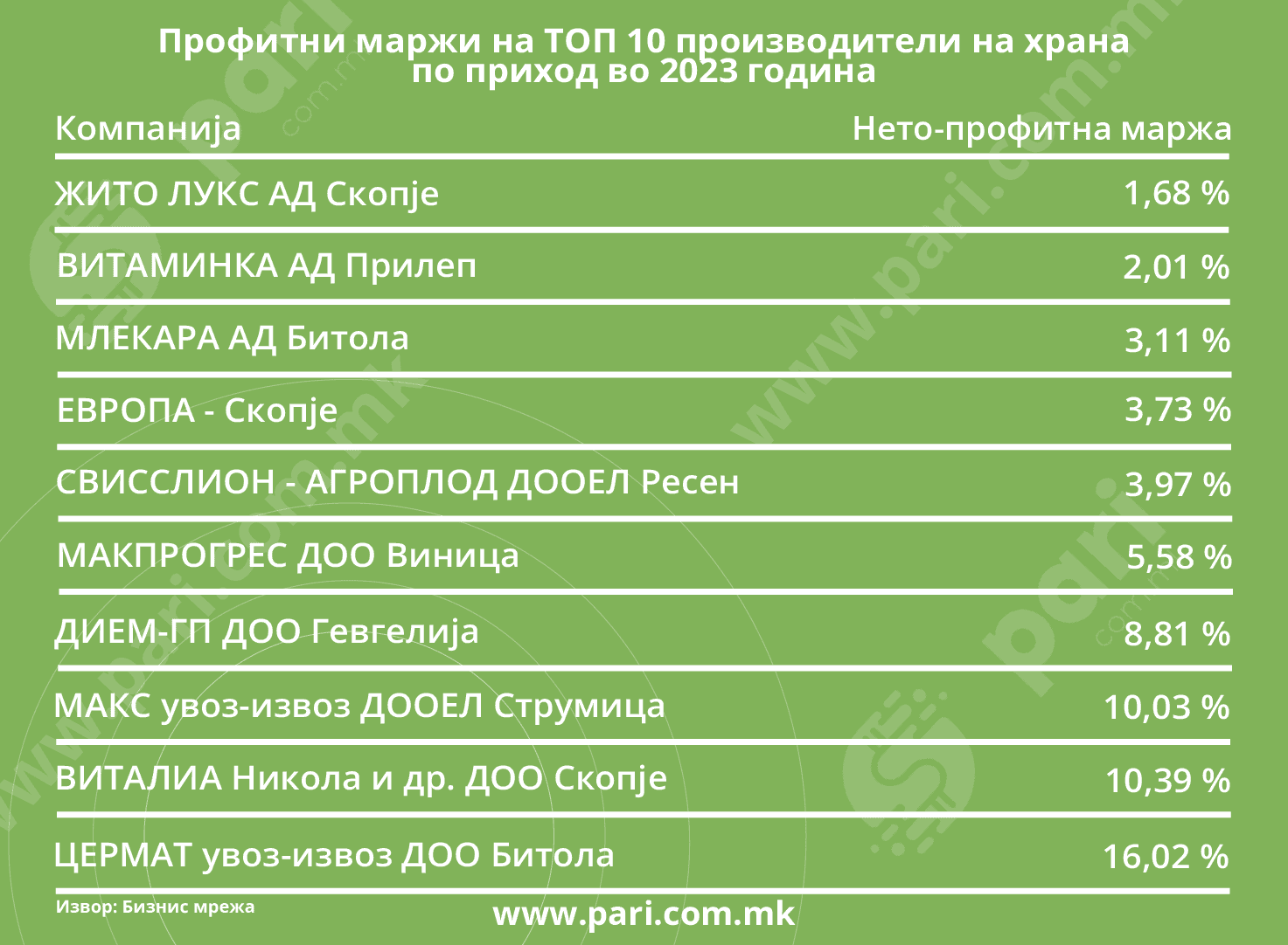 Анализата на десетте најголеми производители на храна по приход во 2023 година покажува дека нивните нето-профитни маржи се движат од 1,68 насто на Жито Лукс до 16,02 насто на Мешовитото друштво за производство на сладолед, трговија на големо и мало, превоз, услуги ЦЕРМАТ увоз-извоз ДОО Битола. Покрај производството на сладолед, ова друштво е познато и по својата палета на замрзнат зеленчук и овошје.