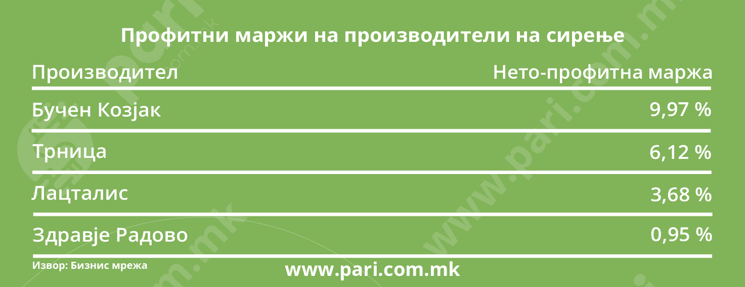 Производителите на сирење не се во нашите ТОП 10 најголеми прехранбени компании, но со оглед на тоа дека македонските граѓани се големи консументи на сирење и дека кај нас доминираат домашните сирења, Пари ги анализираше и нето-профитните маржи на познатите производители на брендовите Бучен козјак, Идеал Шипка, Кораб Трница и Здравје Радово. Нето-профитната маржа на Бучен Козјак е 9,97 насто и е најголема. На ДПТУ Трница е 6,12 насто, на Лацталис, кој е производител на Идеал Шипка, е 3,68 насто, а на Здравје Радово е најниска и изнесува 0,95 насто.