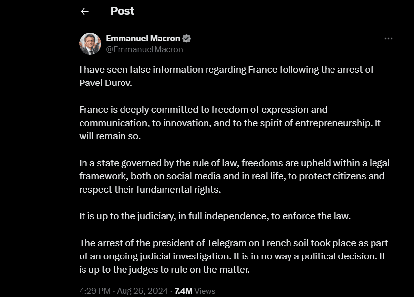 Објавувајќи на социјалните мрежи, Макрон рече дека Франција е „длабоко посветена“ на слободата на изразување, но „слободите се одржуваат во законска рамка, и на социјалните мрежи и во реалниот живот, за да се заштитат граѓаните и да се почитуваат нивните основни права“.
