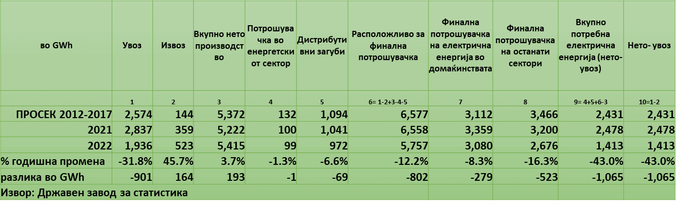 Вкупните потреби за електрична енергија во Македонија во 2022 година (или нето-увозот) се намалија за 1.605 GWh во однос на 2021 година при: пад на финалната потрошувачка на домаќинствата (за 279 GWh или 8,3%) и на останатите сектори (за 523 GWh или 16,3%), пад на дистрибутивните загуби (за 69 GWh) и пад на потрошувачката во енергетскиот сектор (за 1 GWh), а при раст на домашното нето – производство само за 193 GWh (3,7%). Затоа има пад на увозот од 901 GWh, додека пак извозот пораснал на годишна основа за 164 GWh што значи дека ако не сме извезувале во толкав обем ќе сме имале и понизок увоз (или повеќе струја за домашните фирми). Намалената потрошувачка на домаќинствата (кои започнаат да штедат) и на фирмите (кои го намалија обемот на производство, што се гледа во реалниот годишен раст на БДП во 2022 година од само 1% пресметан по трошковен метод со постојани цени) ѝ помогна на Владата да не мора да произведува количини на електрична енергија како во нормални времиња.