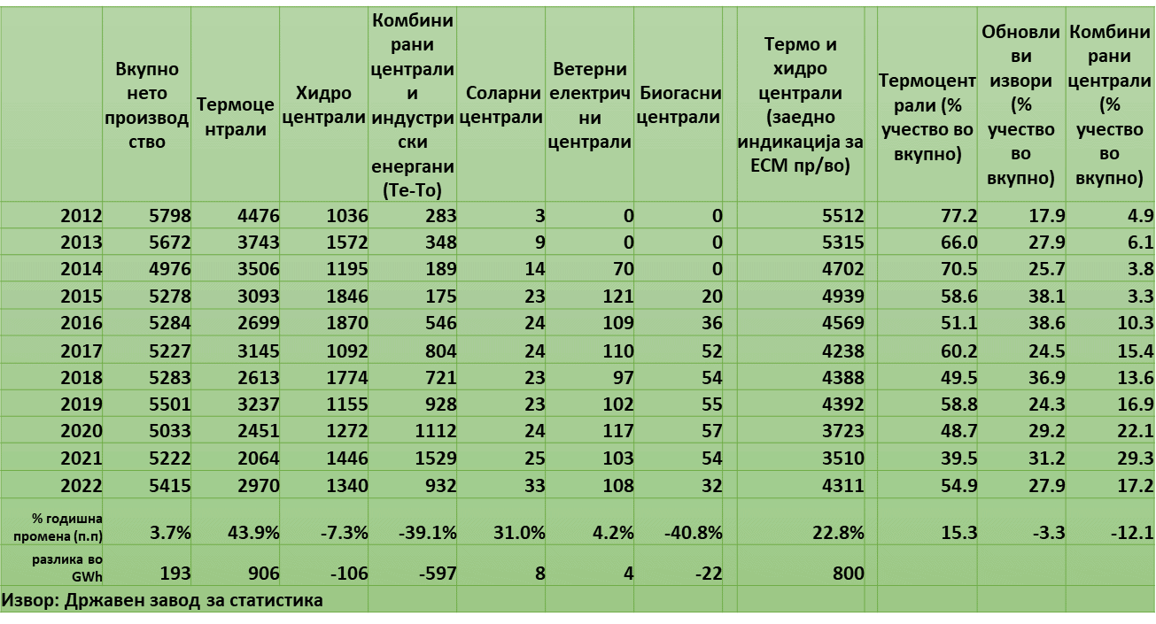 И на крај, во 2022 година имаме фалби за забрзана енергетска транзиција кон обновливи извори на енергија, а производството во најголем дел базира на јаглен и мазут, и притоа учеството на обновливите извори се сведе на 27,9% во вкупното домашно производство на електрична енергија.