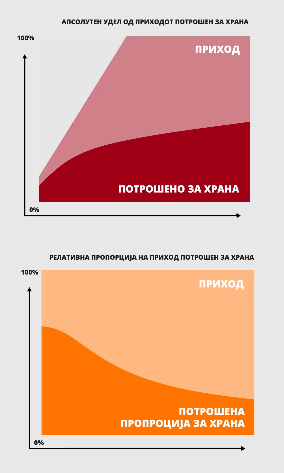- Како што се зголемува фамилијарниот буџет, процентот на потрошени приходи за основни потреби се намалува, иако вкупниот износ се зголемува.