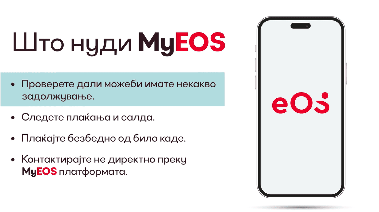 Апликацијата „My EOS“ е развиена на корисниците да им обезбеди брз пристап до нивните финансиски податоци, како што се проверка на износот на задолжувањата, статусот на документите, следење на плаќањата и реализација на нови трансакции. Потребен е само уред со интернет пристап за корисниците да имаат целосна контрола врз своите финансии, без временски ограничувања.