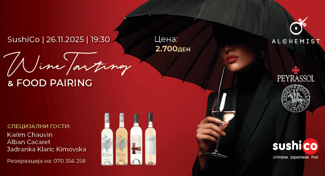 Под внимателна организација на Alchemist MK, официјален увозник на вината Peyrassol во Македонија, гостите ќе имаат можност да вкусат четири одбрани вина од реномираната француска винарија, совршено споени со гурмански јадења подготвени од мајсторите на кујната на SushiCo.