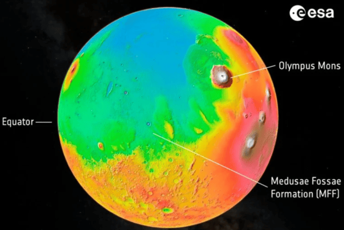 Пред повеќе од 15 години, Марс Експрес ја проучуваше формацијата Медуза Фоса (MFF), откривајќи масивни наслаги длабоки до 2,5 километри. Од овие рани набљудувања, не беше јасно од што се направени депозитите – но новото истражување сега има одговор.