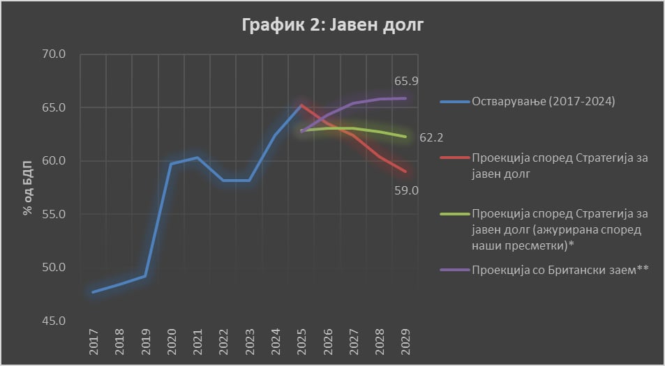 Сепак, според постојните плански документи, не сите инвестиции кои се најавуваат преку ова партнерство се веќе вклучени во планираните буџетски расходи. Така, на пример, единствено мапиран проект е Клиничкиот центар во Штип (Фискална стратегија, стр.42), додека најголемата инвестиција – новата железничка пруга долж Коридорот X – не е буџетски планиран проект (Фискална стратегија, стр.31). Ако овие проекти не се вклучени во постојните среднорочни буџетски проекции, нивната реализација ќе доведе до поголем дефицит од планираниот, а со тоа и до повисок јавен долг. Под претпоставка дека половина од просечниот годишен износ на британскиот заем би претставувал буџетски дефицит над проектираното ниво во Фискалната стратегија, јавниот долг во 2029 година би изнесувал 65,9% од БДП, наспроти моментално проектираните 62,2%“.