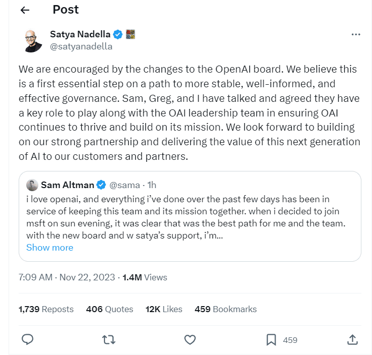 Сите клучни страни објавија за договорот за враќање, за кој ни е кажано дека е завршена работа минус некои документи во последен момент. Алтман рече дека „сè што направив во изминатите неколку дена беше во функција на одржување на овој тим и неговата мисија заедно“.