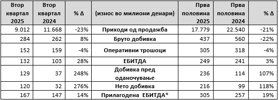 Во првата половина од 2025 година, приходите од продажба изнесуваа 17.779 милиони денари, што претставува намалување од 21% споредено со истиот период минатата година. ЕБИТДА забележа мал раст во споредба со истиот период лани, како резултат на зголемените продажби на домашниот пазар, подобрените извозни маржи, зголемена трговија со електрична енергија со повисоки маржи, како и намаленото негативно влијание од вреднувањето на залихите (56 милиони денари).