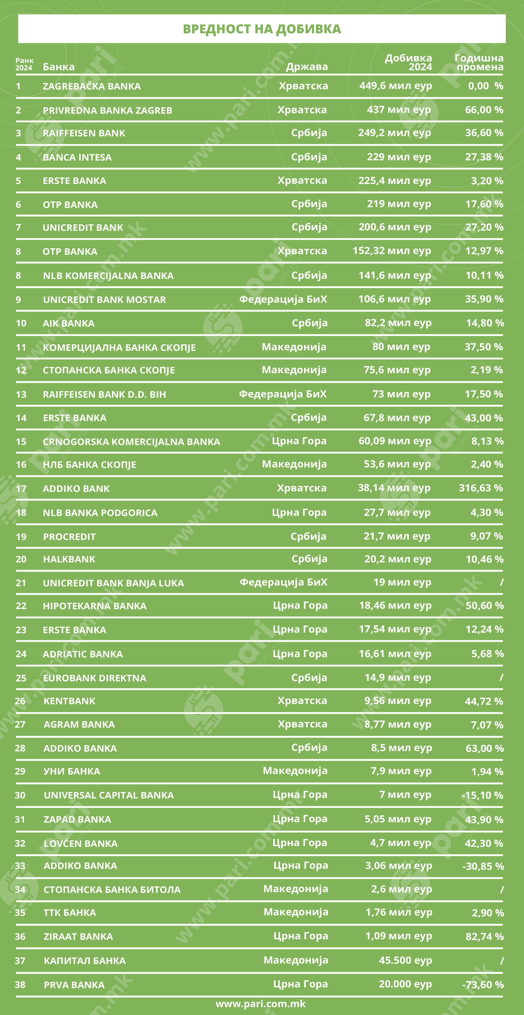 Но, затоа пак, Привредна банка Загреб се заканува да ѝ го преземе приматот на Загребачка банка, која во 2024 година е апсолутен шампион во Регионот според висината на добивиката. Профитот на Загребачка банка за 2024 година изнесува 449,6 милиони евра, но во однос на претходната година нема зголемување. Од друга страна, Привредна банка Загреб со фантастичен раст на профитот од дури 66 насто е на чекор до Загребачка банка. ПБЗ за 2024 година пријави добивка од 437 милиони евра.