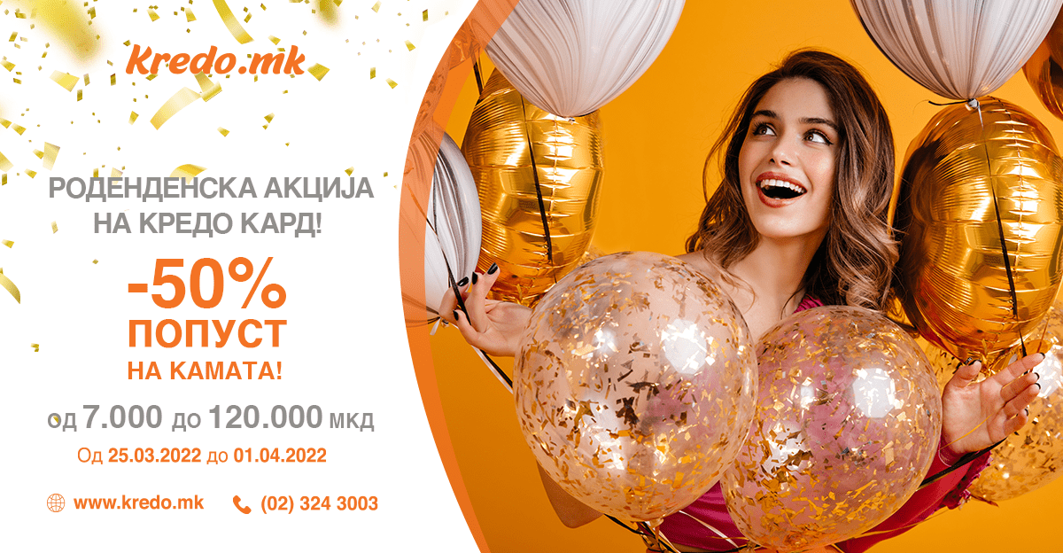 Со цел да ви се заблагодариме на целокупната поддршка во целава измината година и заедно да го прославиме роденденот, ви овозможуваме 50% ПОПУСТ НА КАМАТА на кредити од 7.000 мкд до 120.000 мкд. Одобрување за само 15 минути. Брзо и лесно, аплицирајте и добивајте !