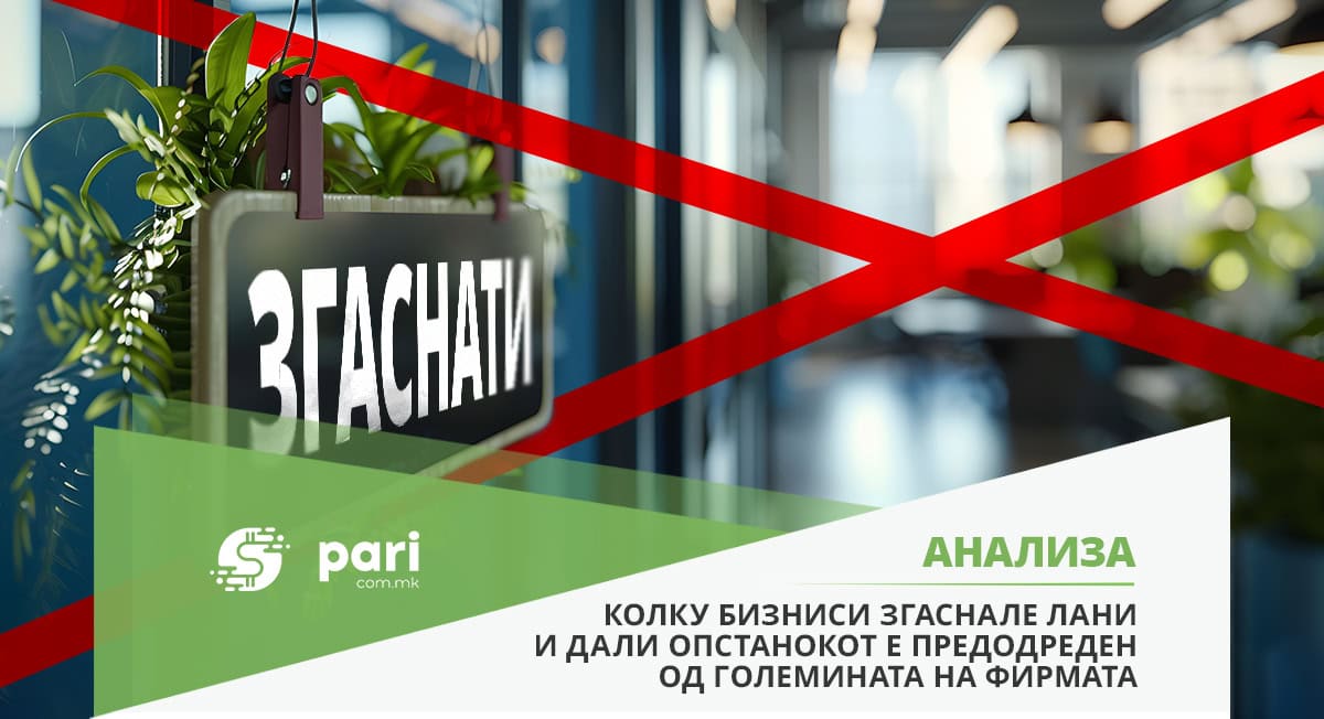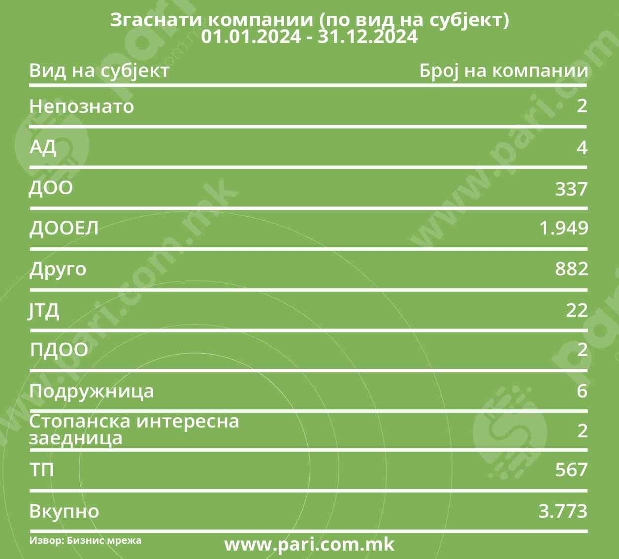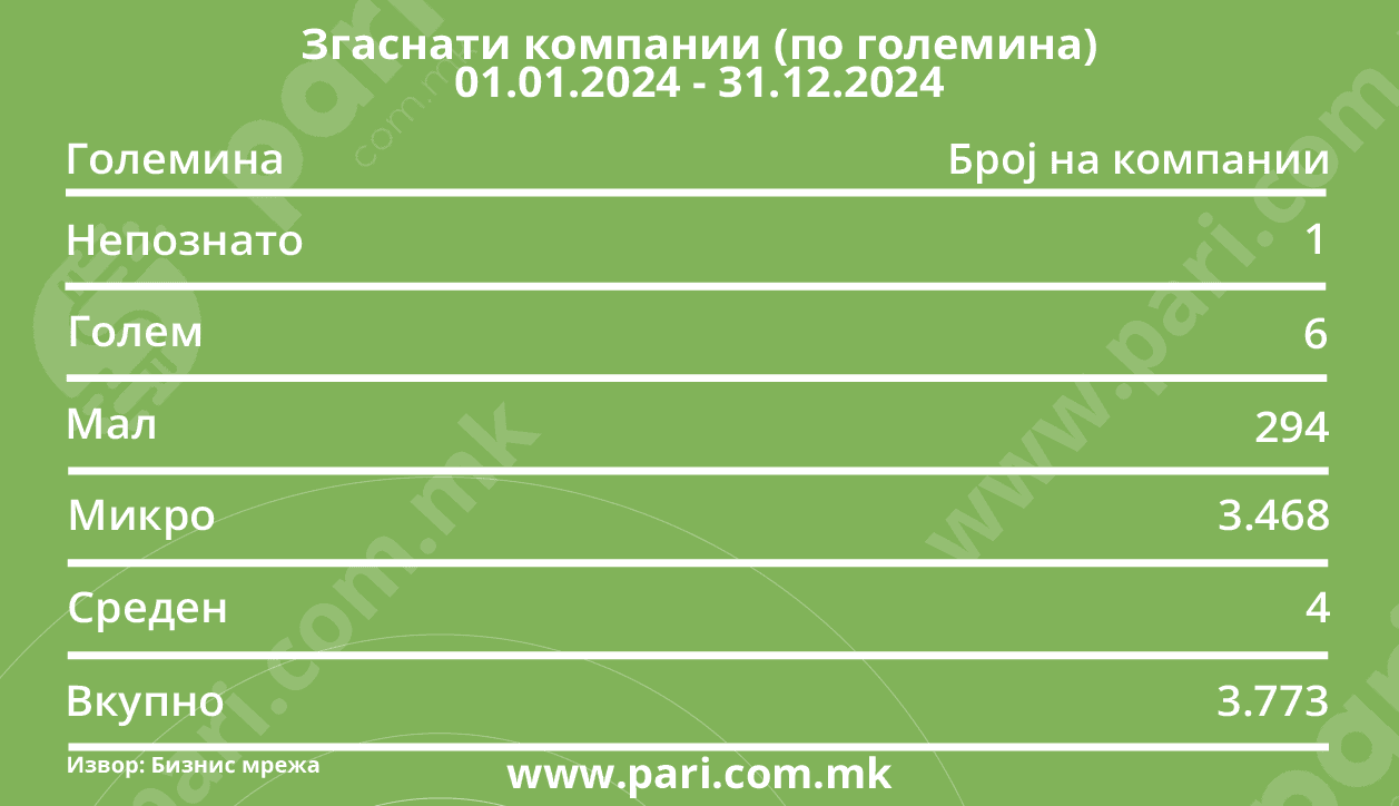 Најтешко опстануваат најмалите. Од вкупно згаснатите 3.773 правни субјекти во 2024, микро фирми се 3.468. Минатата година не ја преживеале ниту 294 мали, а од големите згаснале шест фирми.