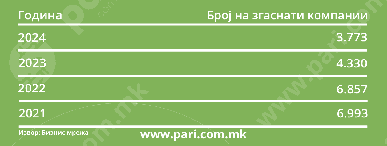 Во текот на 2024 „изгореле“ 3.773 бизниси. За 553 помалку во споредба со 2023 година. Или, за 3.084 во однос на 2022. И уште подобро – за 3.220 помалку од заведените во негативната статистика за 2021 година.