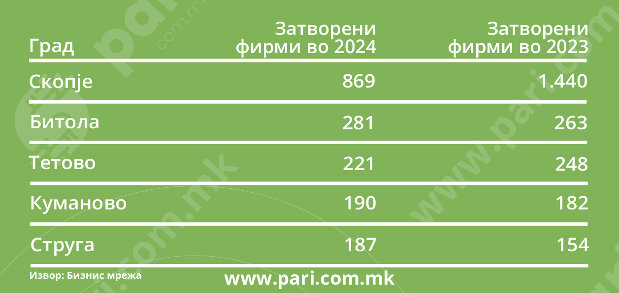 Во Скопје најмногу се отвораат и најмногу се затвораат фирми. Минатата година згаснале 869 бизниси. Разликата од 571 фирма делува оптимистички во споредба со претходната 2023, кога клуч бил ставен на 1.440 претпријатија. Вреди да се спомене дека во 2022 година во главниот град престанале со работа 2.299 фирми.