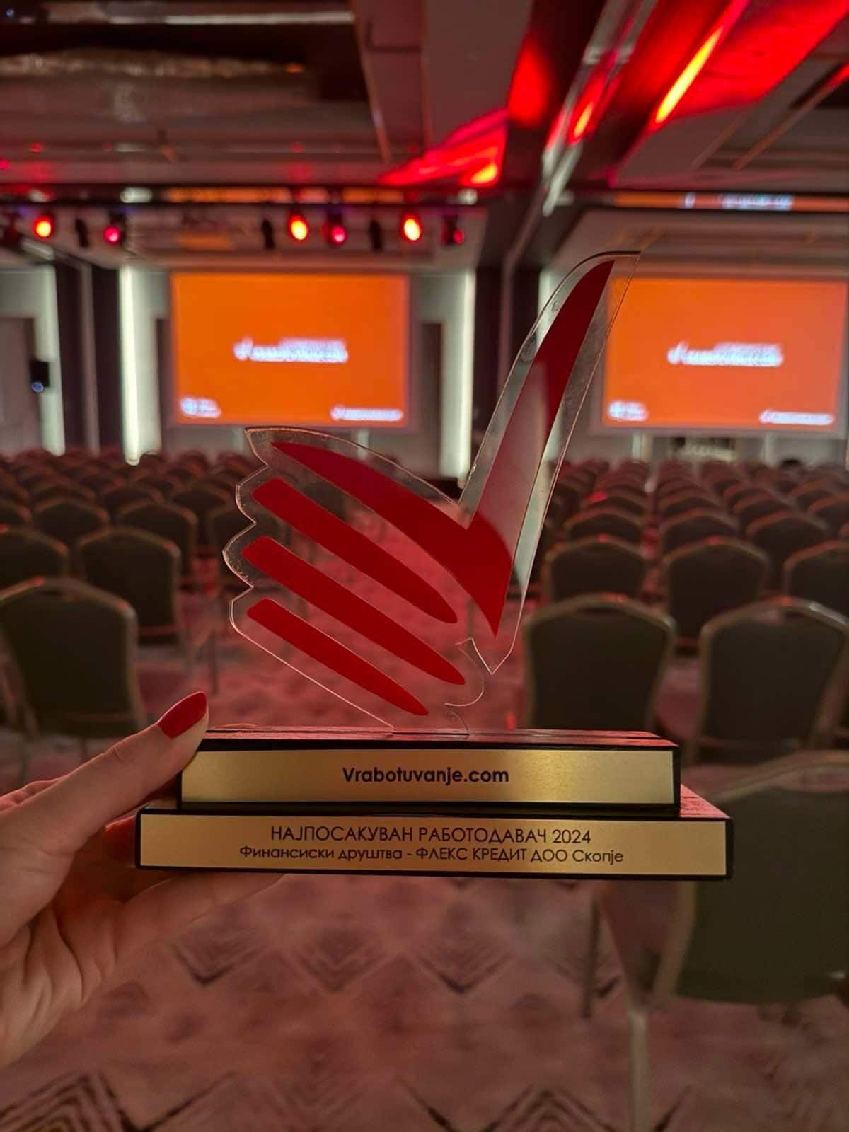 Компанијата Флекс Кредит ја доби престижната награда „Најпосакуван работодавач“ во категоријата финансиски друштва, во рамки на годишниот избор на веб-порталот Вработување.ком за 2024 година.