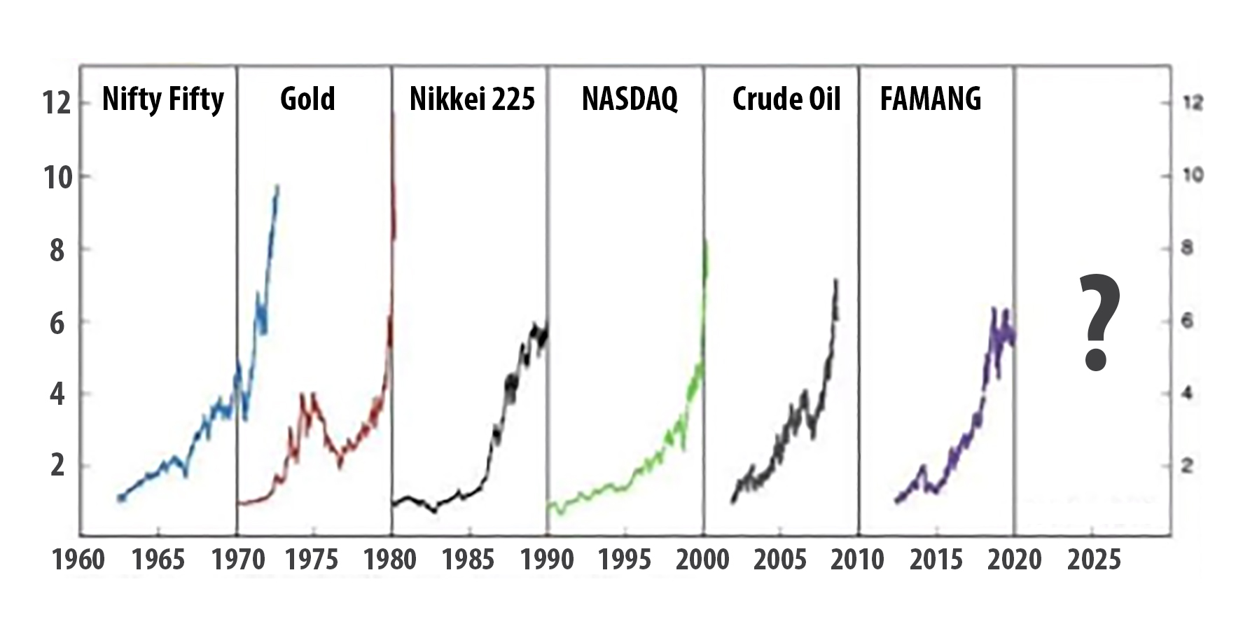 Ваквата психологија кон пазарите, најчесто предизвикана од претходно споменатиот FOMO и надополнета од TINA – Тhere is no Alternative (немањето на добра алтернатива) ги натера денешните инвеститори да создадат 5 корпорации чија пазарна вредност надминува 1 трилион долари ПО КОРПОРАЦИЈА (FAMANG = Facebook со пазарна капитализација од 668 милијарди $, Amazon со пазарна капитализација од 1 трилион и 336 милијарди $, Microsoft со пазарна капитализација од 1 трилион и 503 милијарди $, Apple со пазарна капитализација од 1 трилион и 565 милијарди $, Netflix со пазарна капитализација од 201 милијардa $, Google со пазарна капитализација од 1 трилион $).