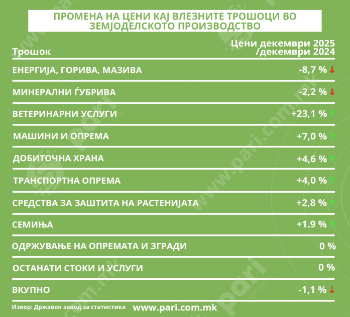 Иако по пазарењето обично коментарот на сите нас е дека цените на земјоделските производи се зголемени, Државниот завод за статистика јасно покажува дека тие во декември 2025 година биле пониски за 4,7 насто во однос на декември 2024 година. Овие цени се однесуваат на продажните цени од самите производители на кои, пак, влезните трошоци им биле пониски за 1,1 насто. Значи, производителите на земјоделски производи одлучиле да попуштат повеќе од намалениот трошок.