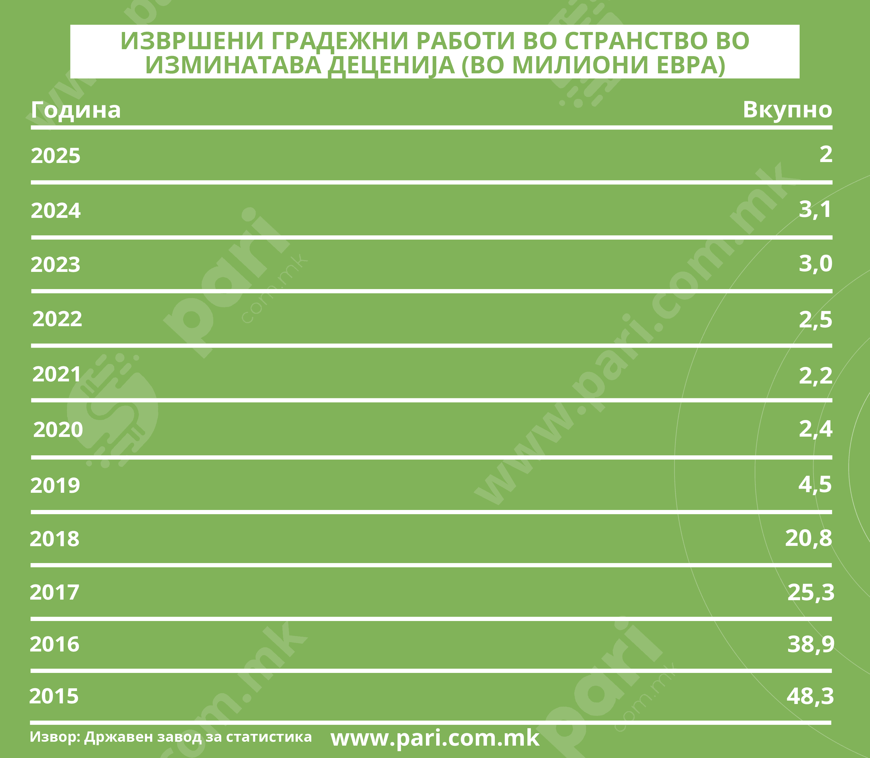 Порталот „Пари“ ги разгледа податоците од Држвниот завод за статистика и дојде до сознание дека во 2015 година вредноста на извршените градежни работи во странство изнесувала 48,3 милиони евра, за разлика од минатогодишните 2 милиони. Податоците покажуваат нагол пресврт во 2019 година, кога од 20,8 милиони евра во претходната година се извршени градежни работи за само 4,5 милиони. Во 2020 година продолжува големиот тренд на намалување на градежните активности во странство. Бројката речиси се преполовува – тогаш нашите компании создале градежна вредност од 2,4 милиони евра. Но, никогаш немало толку мал обем на реализирана вредност како минатата година!