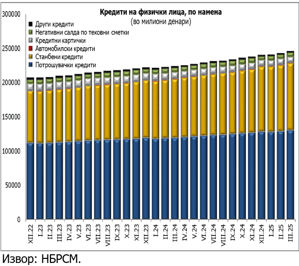 Во март, за повеќе од 20 милиони евра се поголеми најбараните – потрошувачки кредити. Тоа претставува раст од 1,0%, додека годишното позитивно поместување е за 9,2%. Оттаму и вкупната сума од 130,831 милион денари (2,12 милијарди евра).