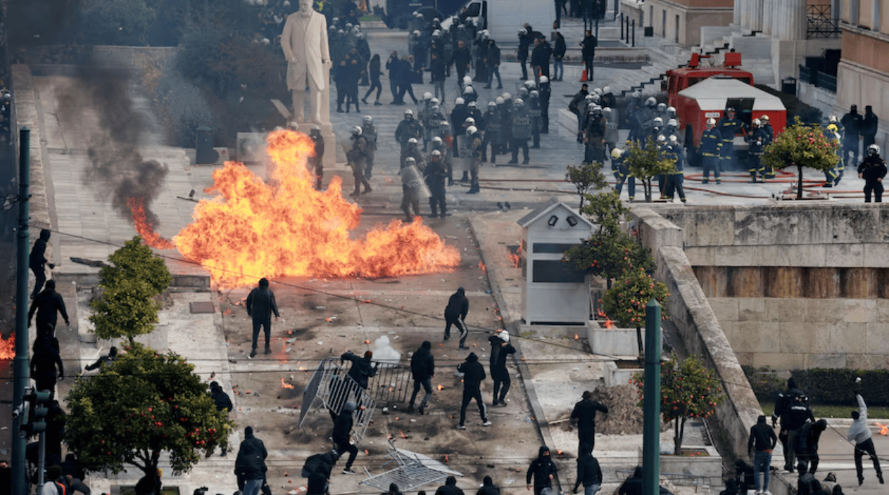Огнените сцени се случија пред зградата на грчкиот парламент во Атина за време на масовните протести по повод втората годишнина од разорната железничка несреќа во северна Грција, во која загинаа 57 лица.