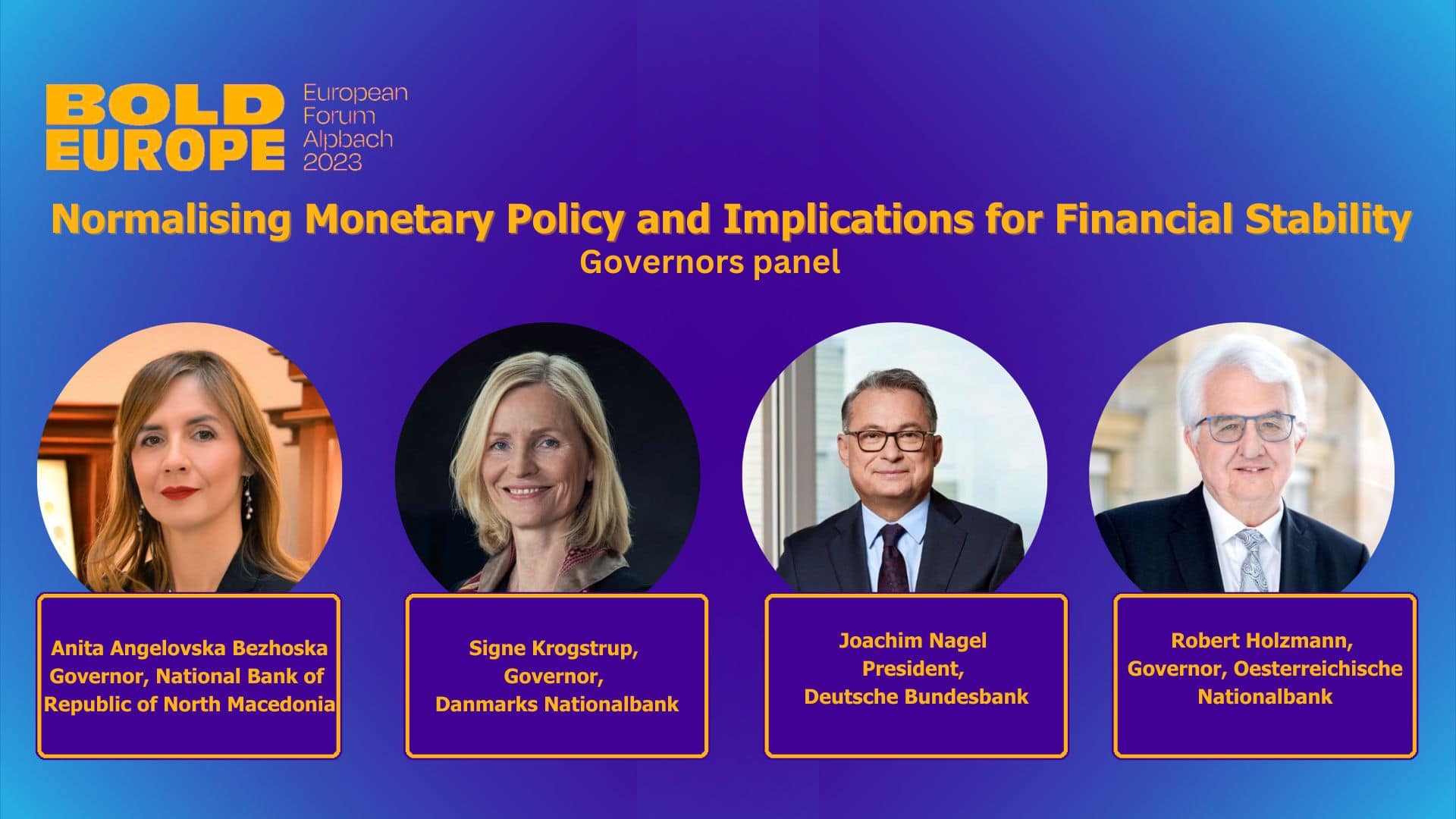 Во време на подолготрајни инфлациски притисоци клучен приоритет на централните банки е стабилизирањето на инфлацијата, за што е потребна затегната монетарна поставеност, која не треба да создава ризици за финансиската стабилност. Затоа, мора да се преземат макро и микропрудентни мерки за одржување и натамошно јакнење на стабилноста на банкарскиот систем. Со преземање мерки на претпазливост, пред да започне монетарното затегнување или во текот на затегнувањето, се јакне капиталниот и ликвидносниот капацитет на банките и се обезбедува поголем простор за централните банки во борбата со инфлацијата. Ова прозлезе од панел-дискусијата „Влијанието на затегнувањето на монетарната политика врз финансиската стабилност“ на Европскиот форум „Смела Европа 2023“, на која учествуваше гувернерката Анета Ангеловска-Бежоска, заедно со гувернерите на Австрија, Германија и Данска, а се одржа во Австрија.