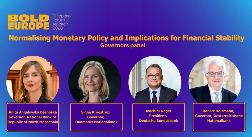 Во време на подолготрајни инфлациски притисоци клучен приоритет на централните банки е стабилизирањето на инфлацијата, за што е потребна затегната монетарна поставеност, која не треба да создава ризици за финансиската стабилност. Затоа, мора да се преземат макро и микропрудентни мерки за одржување и натамошно јакнење на стабилноста на банкарскиот систем. Со преземање мерки на претпазливост, пред да започне монетарното затегнување или во текот на затегнувањето, се јакне капиталниот и ликвидносниот капацитет на банките и се обезбедува поголем простор за централните банки во борбата со инфлацијата. Ова прозлезе од панел-дискусијата „Влијанието на затегнувањето на монетарната политика врз финансиската стабилност“ на Европскиот форум „Смела Европа 2023“, на која учествуваше гувернерката Анета Ангеловска-Бежоска, заедно со гувернерите на Австрија, Германија и Данска, а се одржа во Австрија.